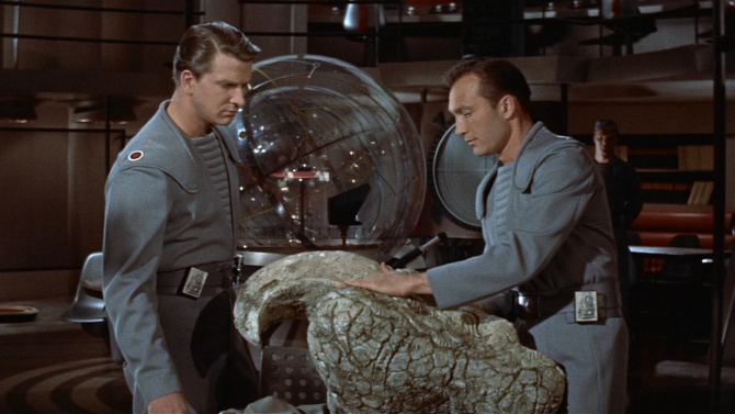hough today’s feature is immediately sited as a science fiction classic, Fred M. Wilcox’s Forbidden Planet (1956) is perhaps just as well remembered for its majestic original robot and pinup infused movie poster design (that is still, to this day, a costly collectible)... though the art is quite misleading when you know what the movie is actually about. Following a narrative loosely inspired by William Shakespeare’s “The Tempest”, which, for those who do not know, is about a man forced to live stranded upon a magical island with his daughter, until he causes a shipwreck that brings with it possible rescue (and a man who may fall in love with his daughter)... this futuristic feature follows a somewhat similar sci-fi blueprint.